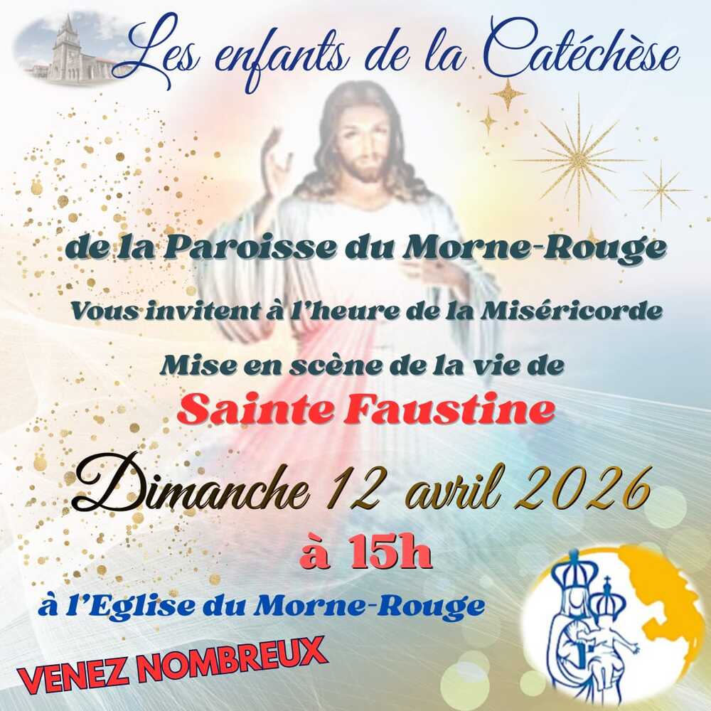 Dimanche12/0415h00Les enfants de la Catéchèse de la Paroisse du Morne Rouge vous invitent à l’heur de la Miséricorde.