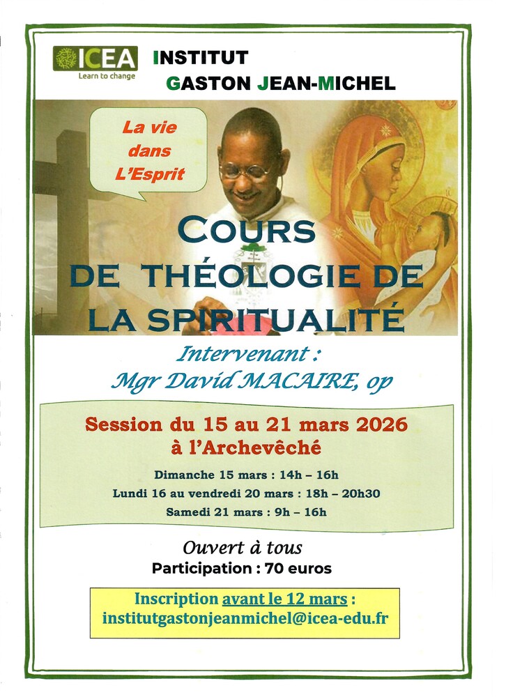 Session de Théologie de la spiritualité du 15 au 21 mars 2026 Dimanche 15 mars : 14h - 16h Lundi 16 au vendredi 20 mars : 18h - 20h30 Samedi 21 [...]