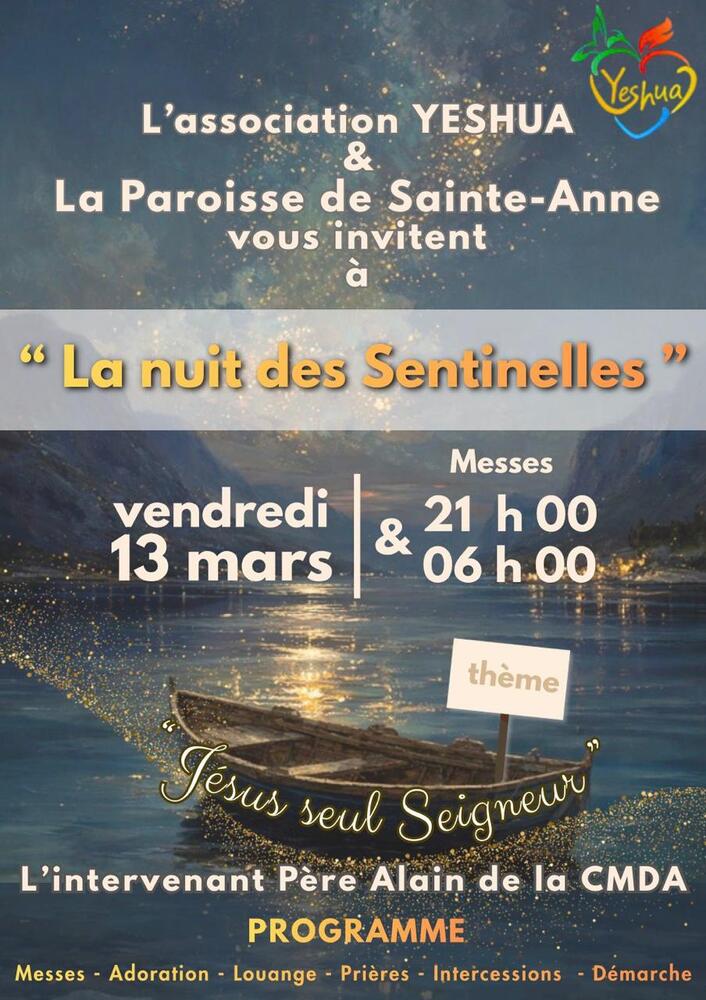 Venez nombreux participer à ce temps de prières de 21h00 à 06h00 en l'église Paroissiale de Ste Anne (Mque), du 130326 au 140326!
