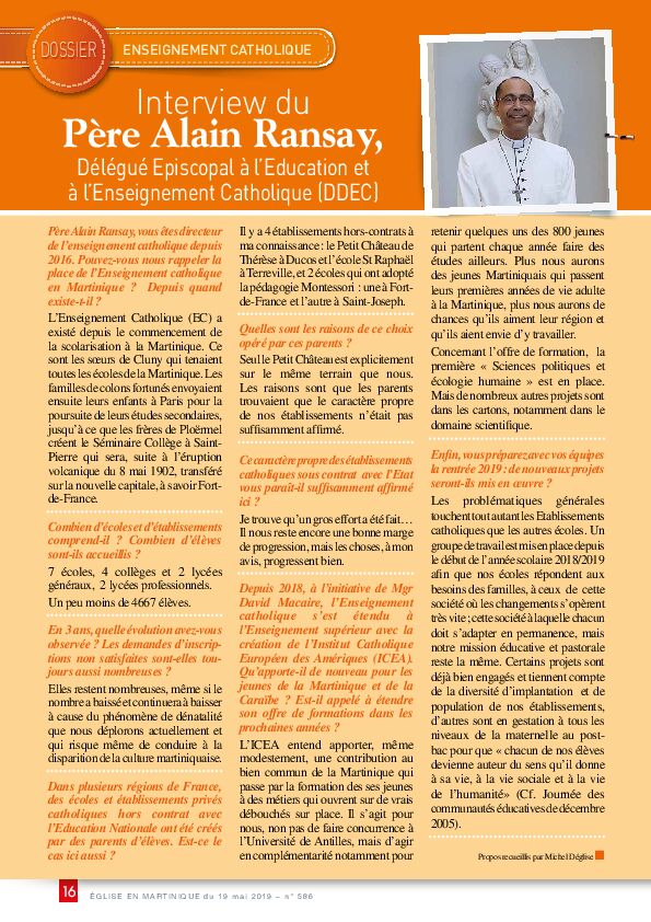 l’Enseignement Catholique, le père Alain Ransay, nous en parle.