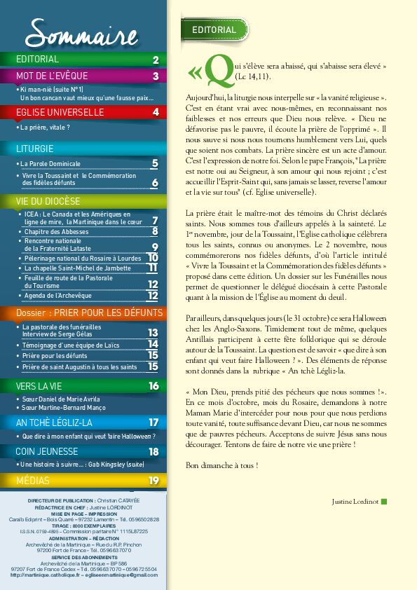 I.S.S.N. 0759-4895 – Commission paritaire N° 1115L87225 ADMINISTRATION – RÉDACTION Archevêché de la Martinique – Rue du R.P. Pinchon 97200 Fort de France - Tél. 05 96 63 70 70