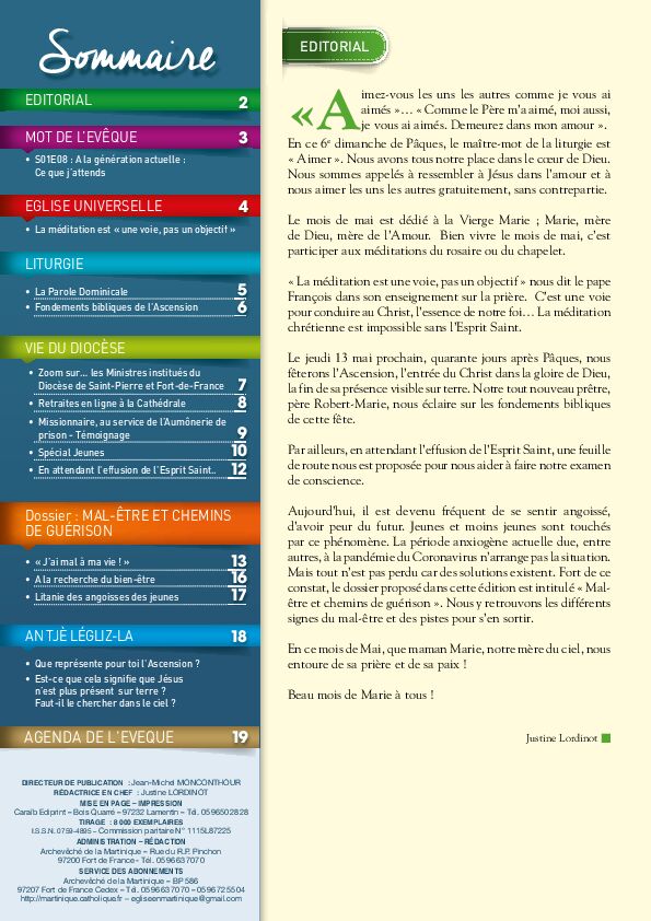 I.S.S.N. 0759-4895 – Commission paritaire N° 1115L87225 ADMINISTRATION – RÉDACTION Archevêché de la Martinique – Rue du R.P. Pinchon 97200 Fort de France - Tél. 05 96 63 70 70