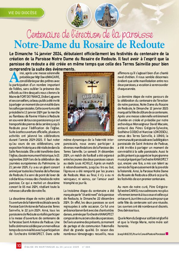 - Centenaire de l’érection de la paroisse Notre-Dame du Rosaire de Redoute