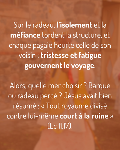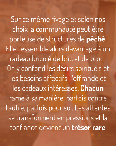 Sur ce même rivage et selon nos choix la communauté peut être porteuse de structures de péché. Elle ressemble alors davantage à un radeau bricolé de bric et de broc. On y confond les désirs spirituels et les besoins affectifs, l’offrande et les cadeaux intéressés. Chacun rame à sa manière, parfois contre l’autre, parfois pour soi. Les attentes se transforment en pressions et la confiance devient un trésor rare.