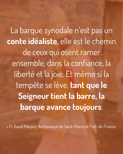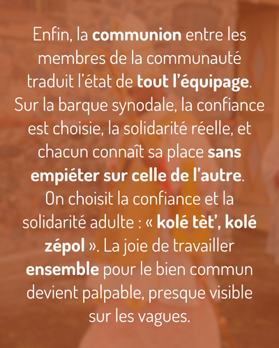 Enfin, la communion entre les membres de la communauté traduit l’état de tout l’équipage. Sur la barque synodale, la confiance est choisie, la solidarité réelle, et chacun connaît sa place sans empiéter sur celle de l’autre. On choisit la confiance et la solidarité adulte : « kolé tèt’, kolé zépol ». La joie de travailler ensemble pour le bien commun devient palpable, presque visible sur les vagues.