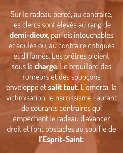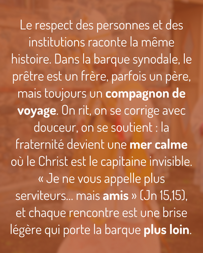 Le respect des personnes et des institutions raconte la même histoire. Dans la barque synodale, le prêtre est un frère, parfois un père, mais toujours un compagnon de voyage. On rit, on se corrige avec douceur, on se soutient : la fraternité devient une mer calme où le Christ est le capitaine invisible. « Je ne vous appelle plus serviteurs… mais amis » (Jn 15,15), et chaque rencontre est une brise légère qui porte la barque plus loin. Sur le radeau percé, au contraire, les clercs sont élevés au rang de demidieux, parfois intouchables et adulés ou, au contraire critiqués et diffamés. Les prêtres ploient sous la charge. Le brouillard des rumeurs et des soupçons enveloppe et salit tout. L’omerta, la victimisation, le narcissisme : autant de courants contraires qui empêchent le radeau d’avancer droit et font obstacles au souffle de l’Esprit-Saint.