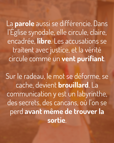 La parole aussi se différencie. Dans l’Église synodale, elle circule, claire, encadrée, libre. Les accusations se traitent avec justice, et la vérité circule comme un vent purifiant.