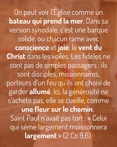 On peut voir l’Église comme un bateau qui prend la mer. Dans sa version synodale, c’est une barque solide, où chacun rame avec conscience et joie, le vent du Christ dans les voiles. Les fidèles ne sont pas de simples passagers : ils sont disciples, missionnaires, porteurs d’un feu qu’ils ont choisi de garder allumé. Ici, la générosité ne s’achète pas, elle se cueille, comme une fleur sur le chemin. Saint Paul n’avait pas tort : « Celui qui sème largement moissonnera largement » (2 Co 9,6).