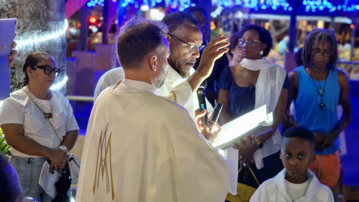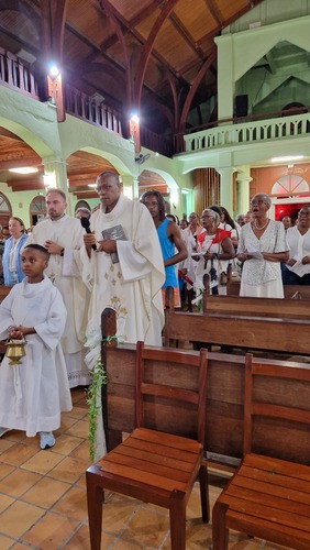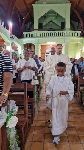La messe solennelle de 18h30 a été présidée par notre curé, heureux d'accueillir comme concélébrant le père Christophe Rébeccai, natif de Schoelcher, actuellement vicaire sur les paroisses de Sainte-Marie et Morne-des-Esses.