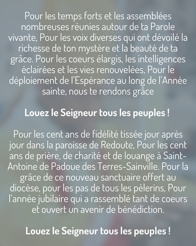 Pour les cent ans de fidélité tissée jour après jour dans la paroisse de Redoute, Pour les cent ans de prière, de charité et de louange à Saint-Antoine de Padoue des Terres-Sainville. Pour la grâce de ce nouveau sanctuaire offert au diocèse, pour les pas de tous les pèlerins, Pour l’année jubilaire qui a rassemblé tant de coeurs et ouvert un avenir de bénédiction.