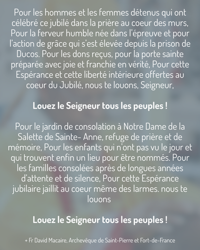 Pour les hommes et les femmes détenus qui ont célébré ce jubilé dans la prière au coeur des murs, Pour la ferveur humble née dans l’épreuve et pour l’action de grâce qui s’est élevée depuis la prison de Ducos. Pour les dons reçus, pour la porte sainte préparée avec joie et franchie en vérité, Pour cette Espérance et cette liberté intérieure offertes au coeur du Jubilé, nous te louons, Seigneur,