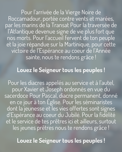 Pour l’arrivée de la Vierge Noire de Roccamadour, portée contre vents et marées, par les marins de la Transat Pour la traversée de l’Atlantique devenue signe de vie plus fort que nos morts. Pour l’accueil fervent de ton peuple et la joie répandue sur la Martinique, pour cette victoire de l’Espérance au coeur de l’Année sainte, nous te rendons grâce !