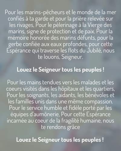 Pour les marins-pêcheurs et le monde de la mer confiés à ta garde et pour la prière relevée sur les rivages, Pour le pèlerinage à la Vierge des marins, signe de protection et de paix. Pour la mémoire honorée des marins défunts, pour la gerbe confiée aux eaux profondes, pour cette Espérance qui traverse les flots du Jubilé, nous te louons, Seigneur.