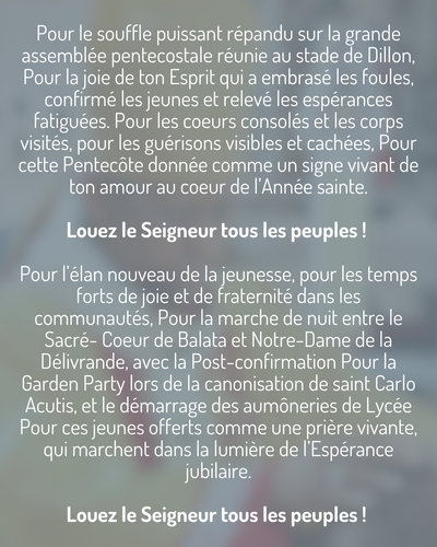 Pour le souffle puissant répandu sur la grande assemblée pentecostale réunie au stade de Dillon, Pour la joie de ton Esprit qui a embrasé les foules, confirmé les jeunes et relevé les espérances fatiguées. Pour les coeurs consolés et les corps visités, pour les guérisons visibles et cachées, Pour cette Pentecôte donnée comme un signe vivant de ton amour au coeur de l’Année sainte.