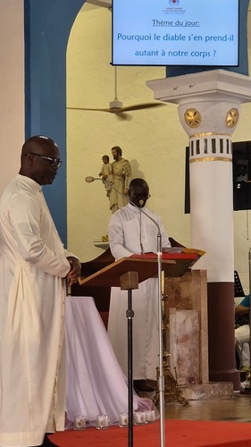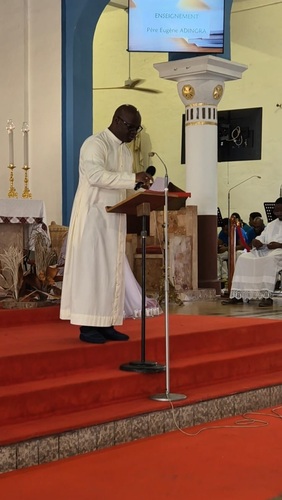 Nous avons ouvert ce temps fort en priant pour le monde entier avec le Chapelet de la Miséricorde Divine. Puis nous avons vécu la plus grande des prières : la Célébration Eucharistique. Ainsi, nourris du Corps et du Sang du Christ, après un temps de louange animé par le groupe « Madin Miséricordia », nous ne faisions qu’un seul corps attentif à l’enseignement puissant du Père Eugène Adingra.