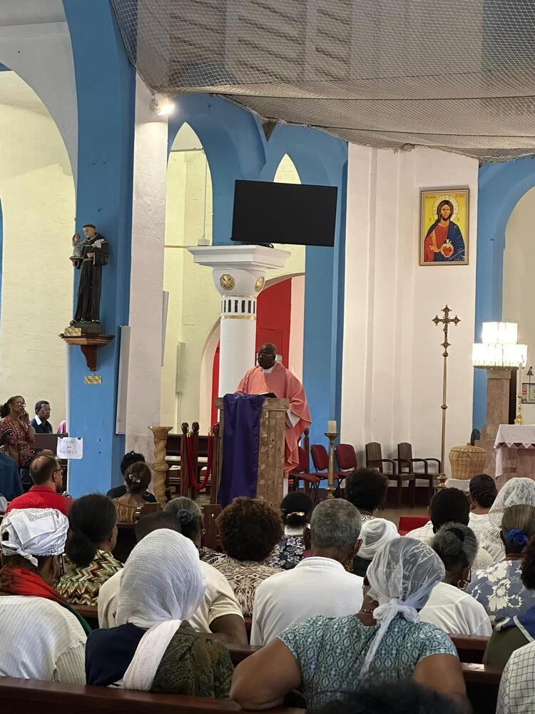 La cérémonie a commencé avec le chant d’entrée « Gaudeamus » qui a donné la note de joie qui convient en ce jour. Monseigneur a présidé la célébration assisté de nombreux prêtres. Le district Nord Caraïbe a été bien représenté avec le père Philippon, curé du Carbet, le père Toglobesse, curé de Bellefontaine, le père Houévoyéha, curé de Saint-Pierre. Etaient aussi présents, le père Niouky qui représentait nos frères de Terreville, le père Aine et le père Tietcheu du Foyer de charité, le père Beaufour, vicaire de la paroisse de Saint-Christophe, le père Aïzo, curé de Sainte-Marie, paroisse de notre soeur, le père Placide, vicaire à Rivière-Salée et Lamentin, et le père Platon, vicaire à Emmaüs. Le père Maixent était à la Kora. Le diacre Pierre Valey a officié et, assis à ses côtés, Alain Boudoua notre fidèle lecteur. Les jeunes Servantes diocésaines Notre-Dame de la Délivrande (SNDD) ont rempli leurs fonctions avec simplicité et discrétion.
