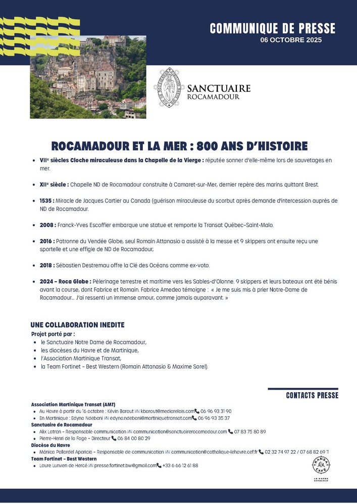 Projet porté par : le Sanctuaire Notre Dame de Rocamadour, les diocèses du Havre et de Martinique, l’Association Martinique Transat, la Team Fortinet – Best Western (Romain Attanasio & Maxime Sorel).
