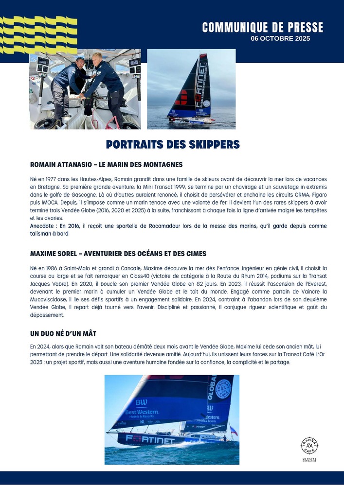 Les deux skippers, Romain Attanasio et Maxime Sorel, incarnent la ténacité, la fraternité et l’espérance. Romain, triple finisher du Vendée Globe, garde depuis 2016 une sportelle de Rocamadour reçue lors de la messe des marins. Maxime, lui, est devenu le premier marin à avoir à la fois bouclé le Vendée Globe et gravi l’Everest. Leur amitié est née d’un geste de solidarité : en 2024, Maxime a offert son mât à Romain, dont le bateau venait d’être démâté. Ensemble, ils forment désormais le duo du Fortinet – Best Western.