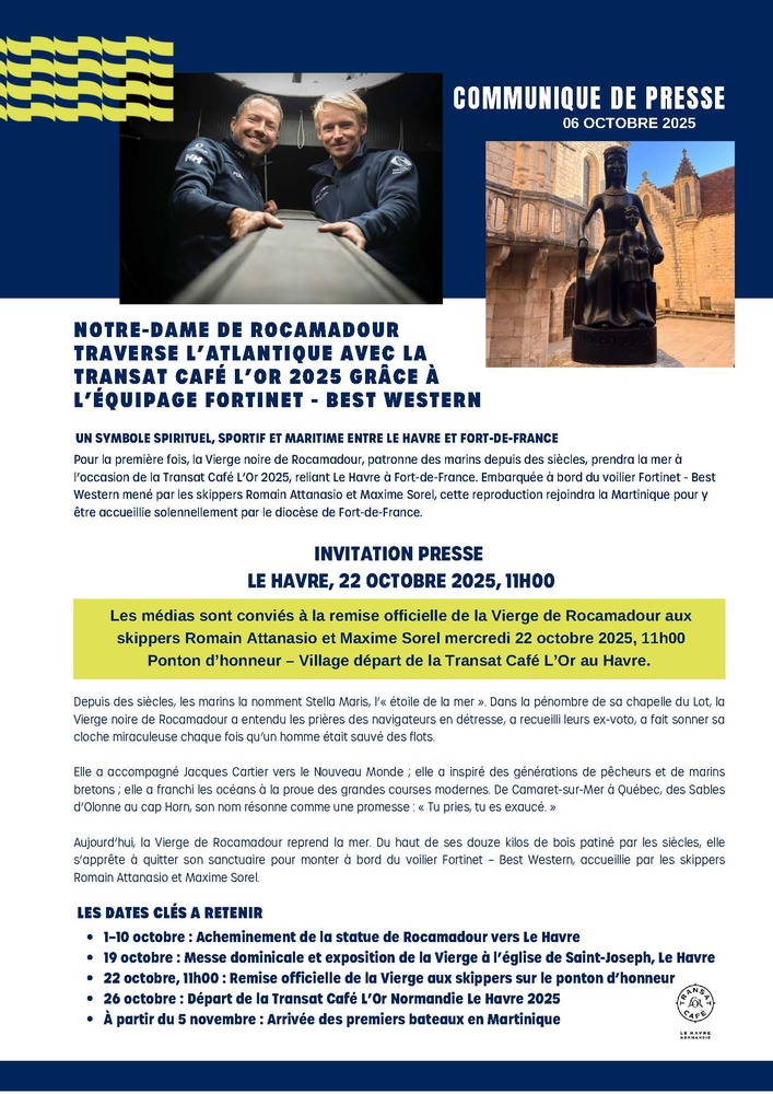 Pour la première fois, la Vierge noire de Rocamadour, patronne des marins depuis des siècles, prendra la mer à l’occasion de la Transat Café L’Or 2025, reliant Le Havre à Fort-de-France. Embarquée à bord du voilier Fortinet - Best Western mené par les skippers Romain Attanasio et Maxime Sorel, cette reproduction rejoindra la Martinique pour y être accueillie solennellement par le diocèse de Fort-de-France.