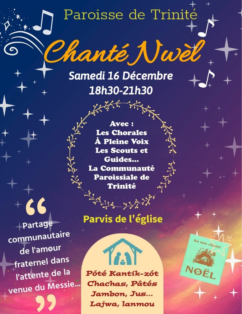 Tous les membres de la communauté sont invités à participer au Chanté Noël traditionnel de la Paroisse ce samedi de 18h30 à 21h30, sur le parvis de l’Église.