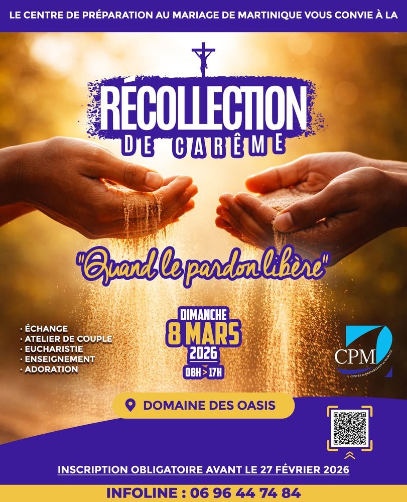 Pour des raisons d'organisation, les inscriptions seront possibles jusqu'au 27 février au plus tard , merci de les effectuer le plus rapidement possible via la billetterie Helloasso en cliquant sur le lien suivant : https://www.helloasso.com/associations/association-des-centres-de-preparation-au-mariage-de-la-martinique/evenements/recollection-de-careme-2026