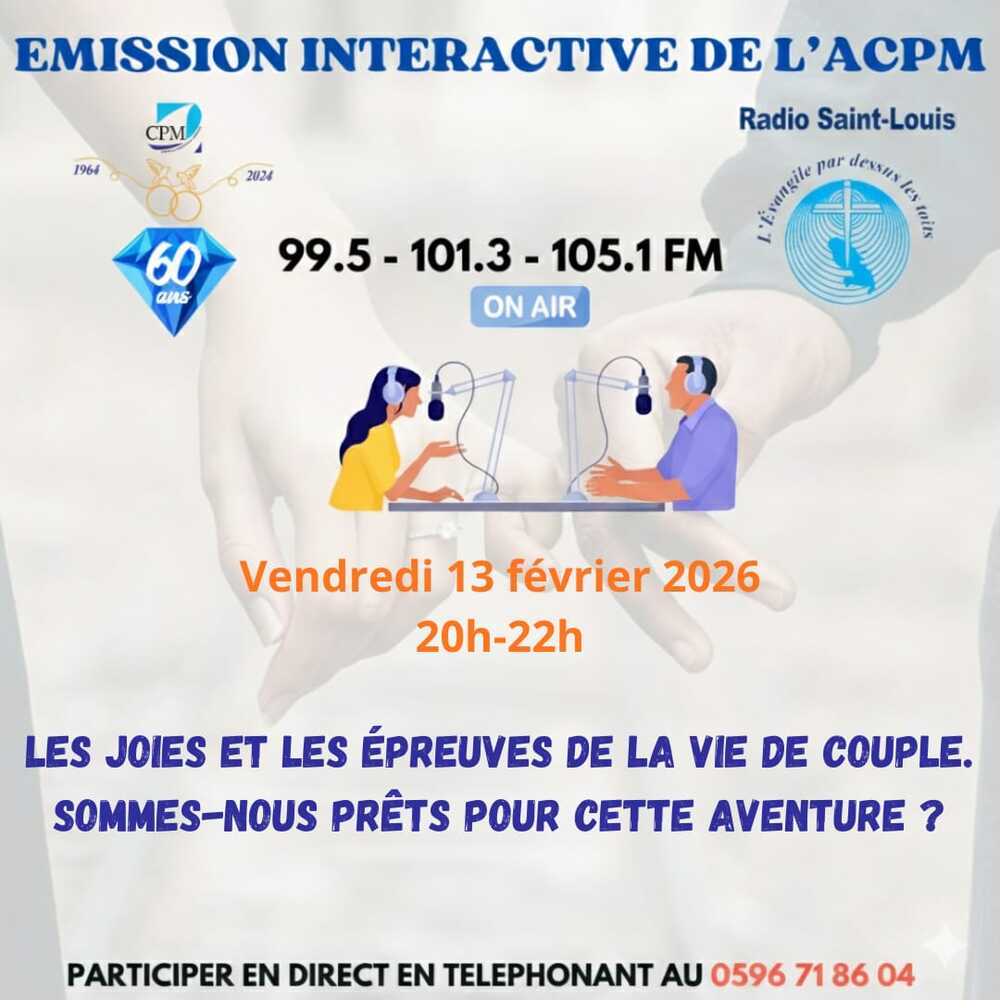 Informations 13/02/2026 20:00-22:00 CPM (Diocèse de Martinique) Emission Radio interactive animée par le CPM autour de thématiques concernant le mariage et la vie de couple avec des témoignages de couples animateurs du mouvement.