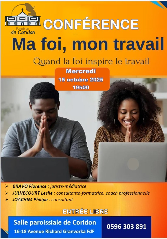 Face à la quête croissante de sens et aux défis éthiques du monde professionnel, La Paroisse de Coridon organise une conférence exceptionnelle pour explorer l'intégration de la foi chrétienne dans l'environnement du travail. Cette conférence propose de dépasser la simple notion de gagne-pain pour le considérer comme un lieu de vocation, de service et de développement personnel... Venez nombreux partager et échanger : entrepreneurs, managers, employés, ou professionnels en transition, désireux de vivre votre foi de manière authentique et constructive au bureau, à l'atelier, au chantier... ou dans vos interactions quotidiennes. Venez vous équiper et être inspiré pour transformer votre lieu de travail en un espace où votre foi peut s'exprimer par l'excellence, l'engagement et l'humanité. Vous êtes tous les bienvenus !!