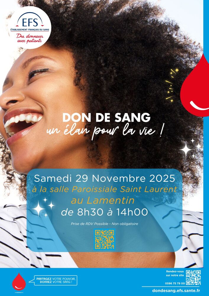 Informations 29/11/2025 08:30-14:00 Salle Saint Laurent Le Lamentin Collecte de sang avec l’Etablissement Français du Sang à la salle Saint Laurent de 8h30 à 14h00