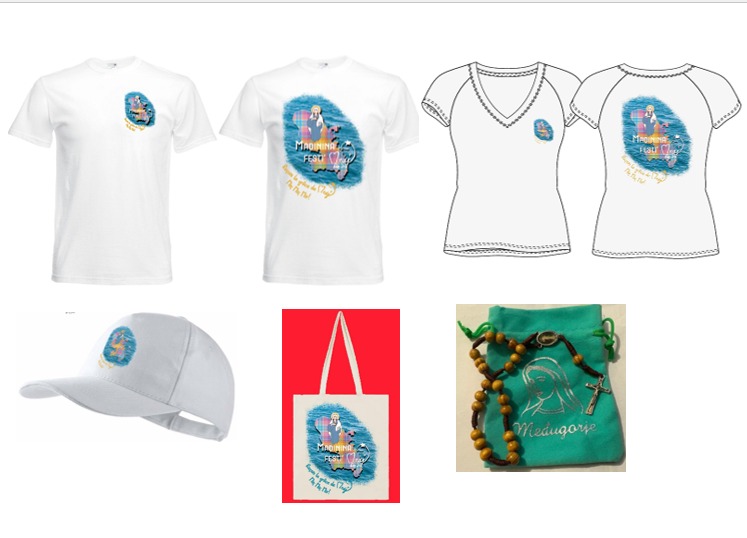 🛍️ Pour couvrir partiellement les dépenses importantes liées à cet évènement, les teeshirts, casquettes et autres articles à son effigie sont proposés aux fidèles.