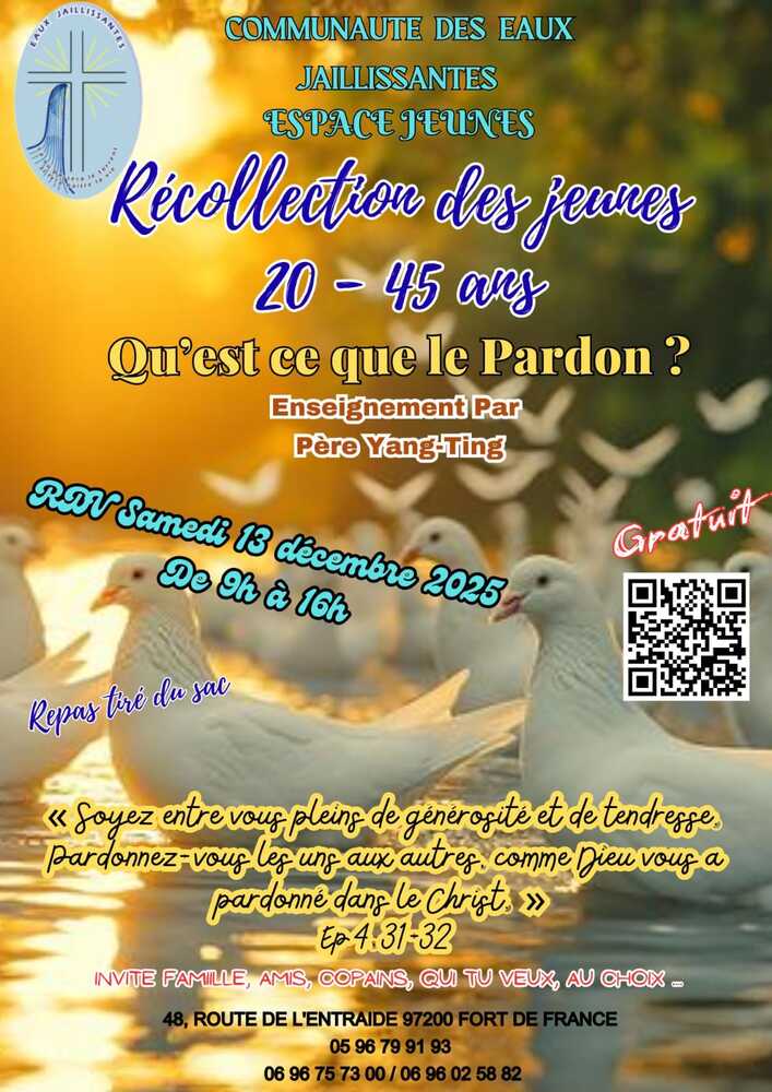 Informations 13/12/2025 09:00-16:00 Communauté des Eaux jaillissantes (Diocèse de Martinique) Recollection des jeunes de 20 à 45 ans. Thème: Le pardon