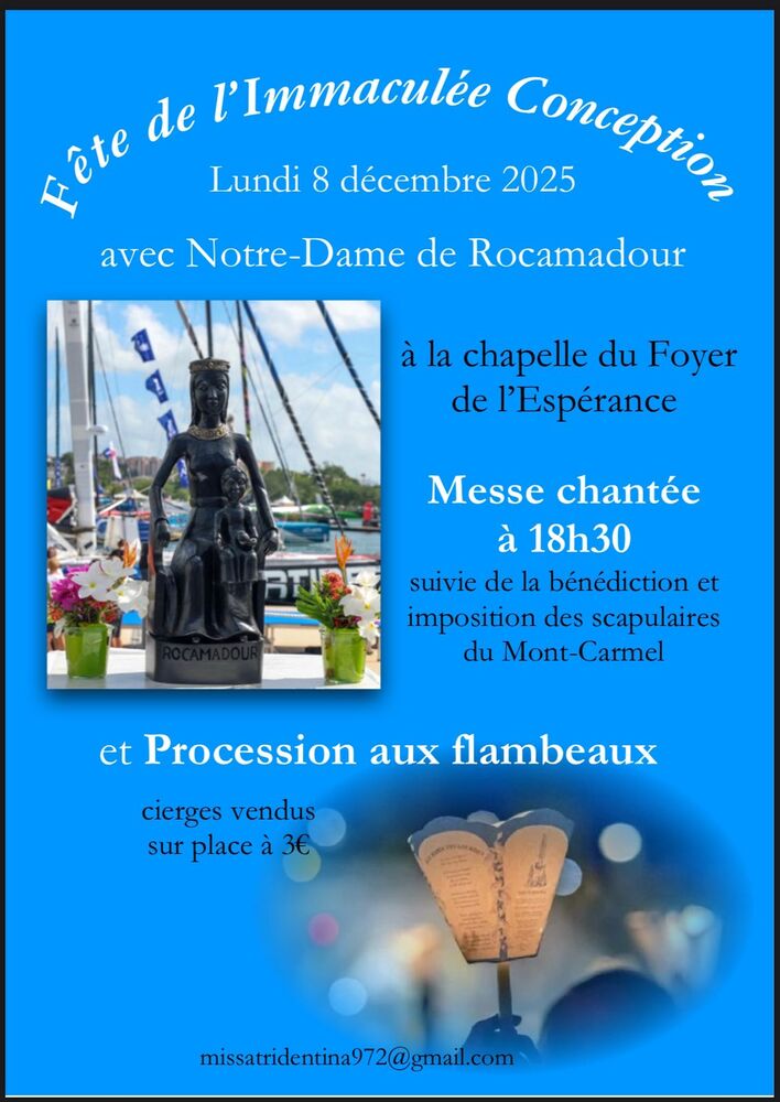 Informations 08/12/2025 18:30-23:59 Chapelle de l'Espérance (Diocèse de Martinique) Messe chantée suivie de la bénédiction et imposition des scapulaires du Mont-Carmel