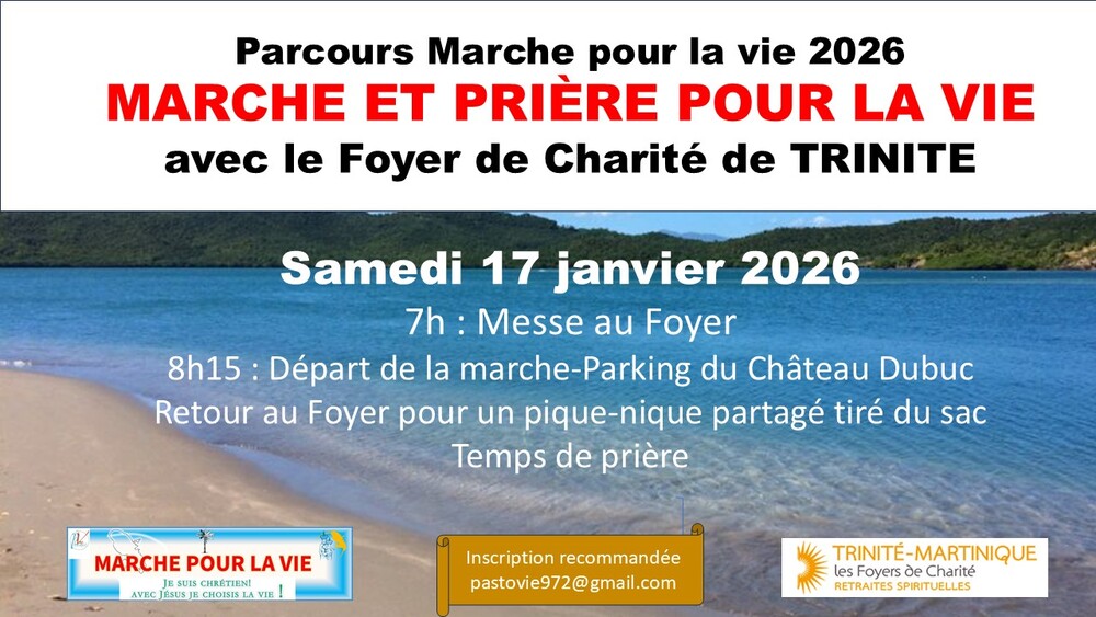 Dans le cadre de la Marche pour la vie 2026, le Foyer de charité de Trinité et la Pastorale de la vie vous invite à participer le samedi 17 janvier 2026 à Marche et prière pour la vie. La messe aura lieu à 07h00 au Foyer de charité. Départ de la marche sur la Caravelle à 08H15 au parking du Château Dubuc. Retour au Foyer pour un pique-nique partagé tiré du sac suivi d’un temps de prière de célébration de la vie.