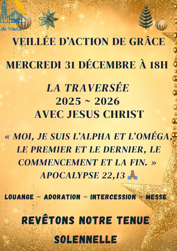 Informations 31/12/2025 18:00-21:30 EGLISE SAINT JEAN BAPTISTE DU VAUCLIN Le Vauclin 🌟 AU TERME DE CETTE ANNÉE 2025, VENONS RENDRE GRÂCE A DIEU ET ENTAMER CETTE NOUVELLE ANNÉE AVEC LUI ! 🙏🏾❤️🔥💫