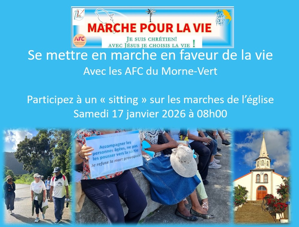 Rendez-vous à 08h00 pour un SITTING sur les marches de l’église du Morne-Vert samedi 17 janvier 2026 à l'initiative des AFC du Morne-Vert dans le cadre de la Marche pour la vie 2026, manifestation annuelle pour la promotion et la défense de la vie humaine.
