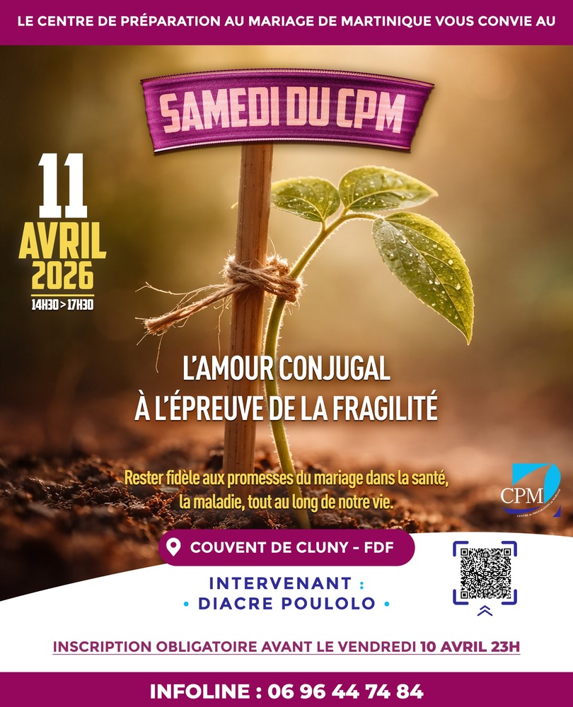Inscription avant le VENDREDI 10 Avril 2026 - 23h - Participation aux frais 5€/personne soit 10€ pour le couple via la lien suivant : https://www.helloasso.com/associations/association-des-centres-de-preparation-au-mariage-de-la-martinique/evenements/samedi-du-cpm-du-11-04-2026