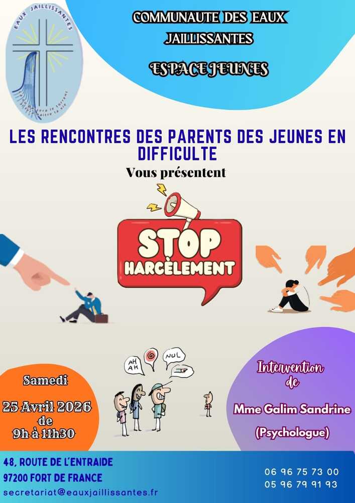 Informations 25/04/2026 09:00-11:30 Communauté des Eaux jaillissantes (Diocèse de Martinique) Thème: Stop harcèlement